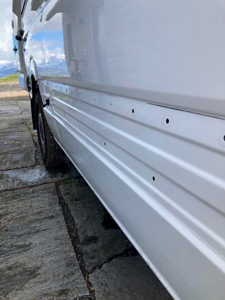 Die Mercedes Leute haben wohl auch mal in geistiger Umnachtung geplant, denn unter den (unnützen..?) Kunststoffseitenleisten läuft ganz wunderbar das Wasser rein und weiter in den Fahrzeuginnenraum durch die Löcher mit den Nubsis (lustiges Wort aber keine Ahnung wie die Dinger richtig heissen). An dieser Stelle ein grosses Dankeschön an meinen Lieblingsmann der in unendlicher Geduld abertausende Youtubevideos zu all möglichen Themen schaut und das meistens mehrfach (mein Gehirn hätte sich schon längst mit einem Aperol Spritz in die nächste Ecke verzogen) und so auf solche Dinge aufmerksam wird.