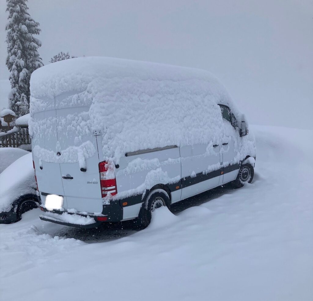 Ist unpraktisch wenn dein Auto Arctic White lackiert ist und es eingeschneit wird – mussten unseren Ferdinand letztes Wochenende erst mal im Schnee suchen bevor wir die Inneneinrichtung vornehmen konnten. Also Inneneinrichtung mit den behelfsmässig zusammengeschusterten Kartonmöbel und Malercrepkombinationen, empfiehlt sich aber sehr um das Geplante mal in «echt» zu überprüfen. So konnten wir am Winterrückkehrtag wenigsten ein bisschen vorwärts kommen und haben uns nun, so glaub ich wenigstens, entschieden wie unser Büsli Innen aussehen wird. Denn die ganzen Dichtungsmassen und Kleber sind echte Sissis in der Anwendung – die lieben Materialien wollen dann bitteschön nicht unter 5 Grad verarbeitet werden, neinnein.